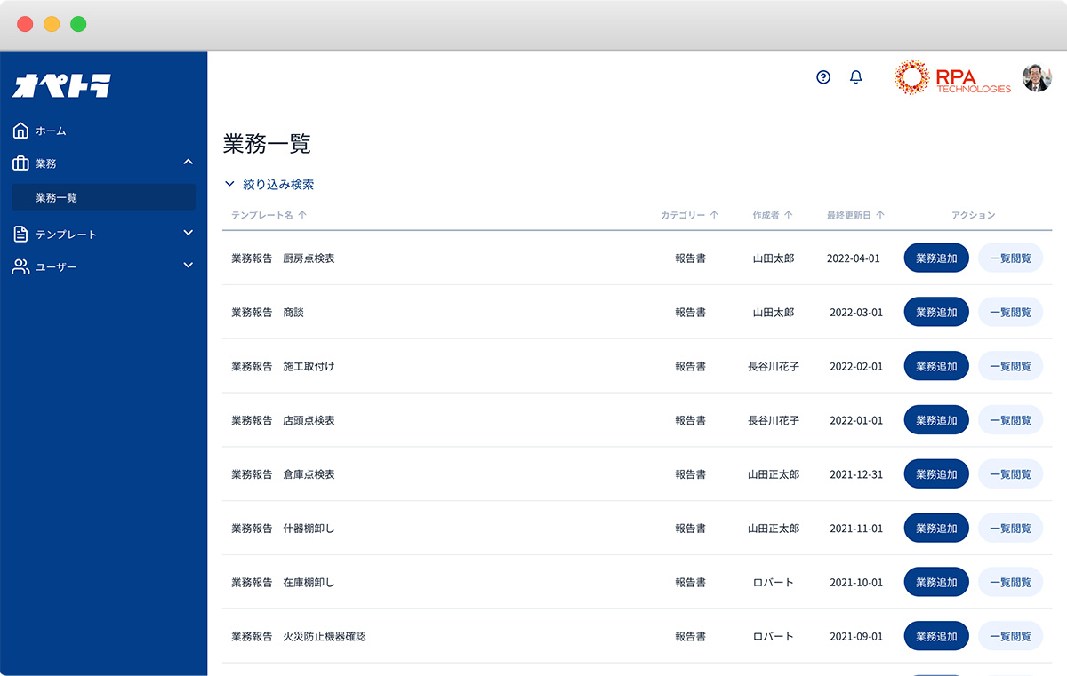 オペトラはこのような様々な課題を解決すべく、ただ複雑になりすぎて導入に至らず根本的な解決に至らないことを避けるために、必要な機能を必要な人にだけ使えるように設計をしています。報告作業に関わる権限のユーザーは報告作業機能のみに特化し、管理に関わる権限のユーザーは、管理機能を使いやすく、かつ把握できるように特徴づけています。オペトラはこのような様々な課題を解決すべく、ただ複雑になりすぎて導入に至らず根本的な解決に至らないことを避けるために、必要な機能を必要な人にだけ使えるように設計をしています。報告作業に関わる権限のユーザーは報告作業機能のみに特化し、管理に関わる権限のユーザーは、管理機能を使いやすく、かつ把握できるように特徴づけています。