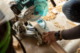 電動ノコを使用して木材の加工中に、補助の木材を使用して捲くところを手で押してしまい手が歯に接触しそうになる
