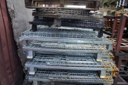 フォークリフトで移動させていた4段積みの金属パレットの4段目が急ブレーキにより落下する