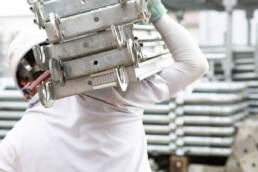 従業員2人で鉄板を運搬中に足がもつれて転倒しそうになる